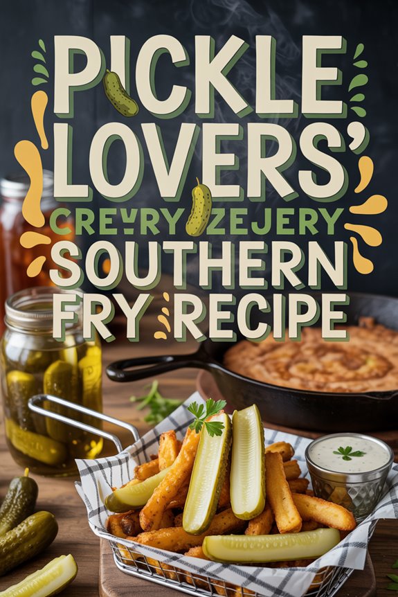 As each batch finishes, transfer them to paper towels to drain excess oil, and keep them warm in a 200°F oven until all your pickles are fried to golden perfection. For an authentic Southern experience, consider frying these pickles in a premium Mexican cookware set that distributes heat evenly for perfect results every time. The result? Crispy, tangy pickle fries that’ll disappear from the plate faster than you can say “Southern comfort food.”